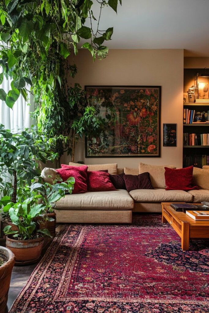 This deep red, Persian-inspired rug acts as the foundation of the room. Positioned beneath the sofa and coffee table, it visually anchors the seating area and creates a natural flow throughout the space. The rug ties the furniture together, making the room feel organized and complete.